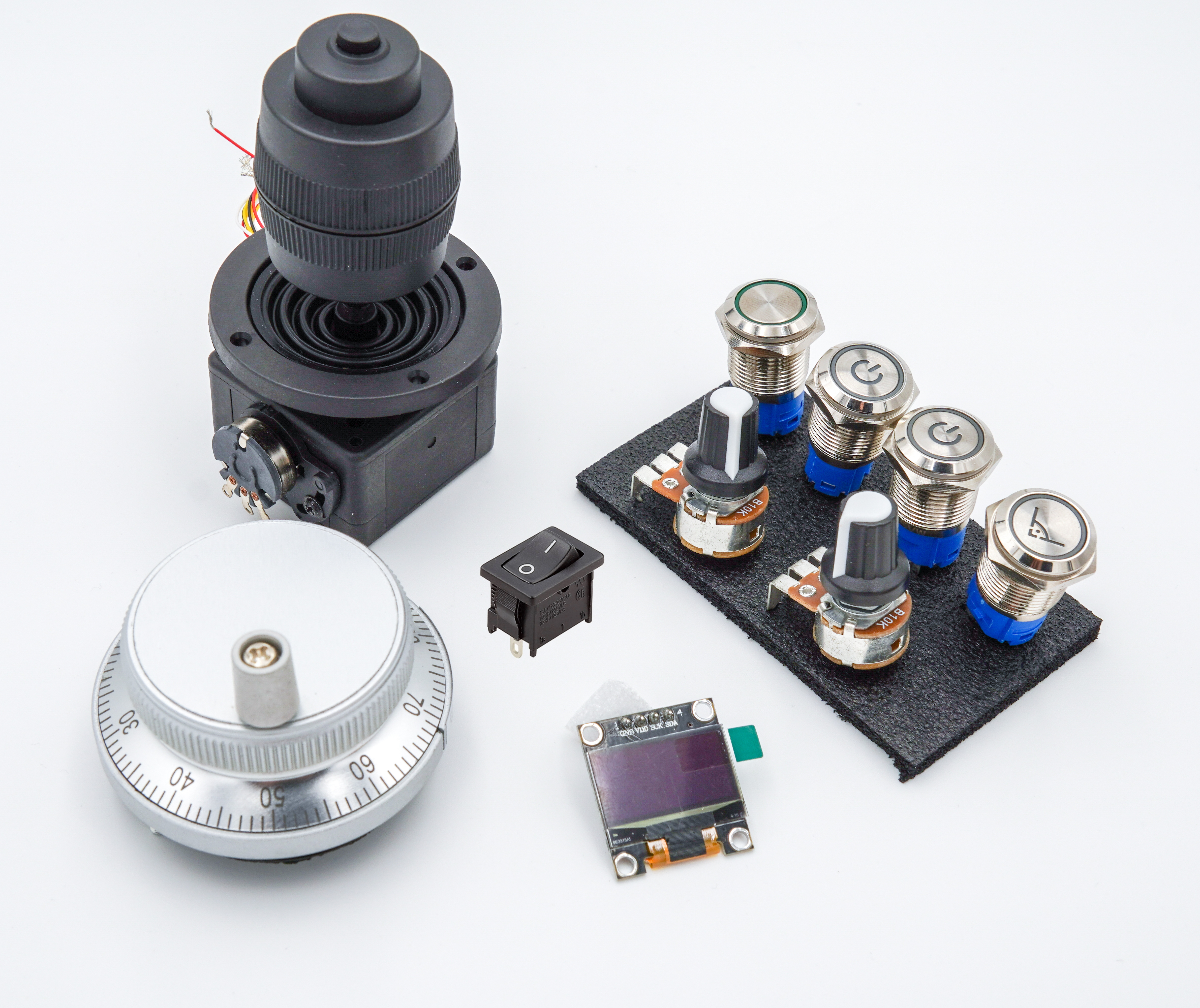 - Joystick mit 3 Achsen und OK-Taster (zum Abnullen der Achsen)