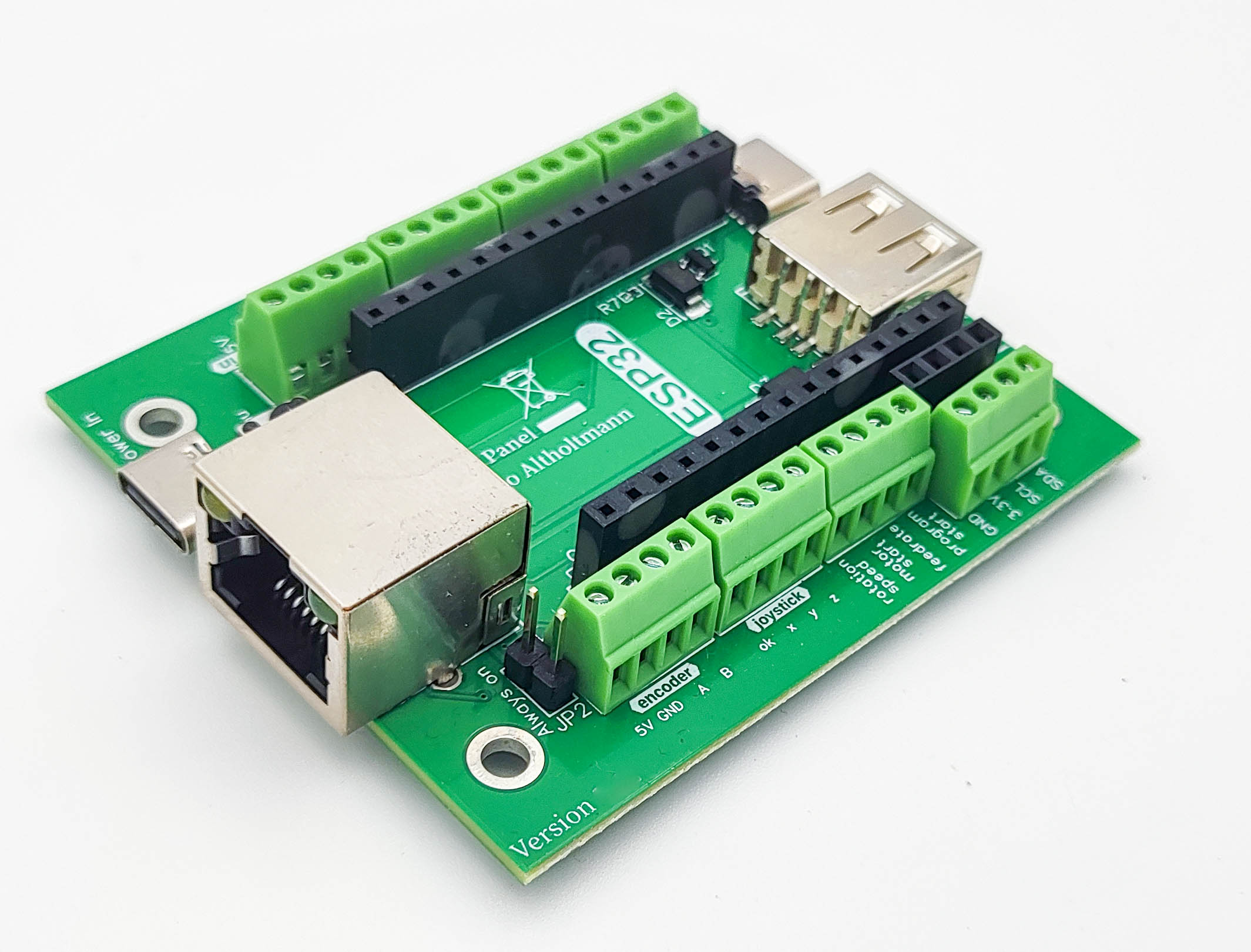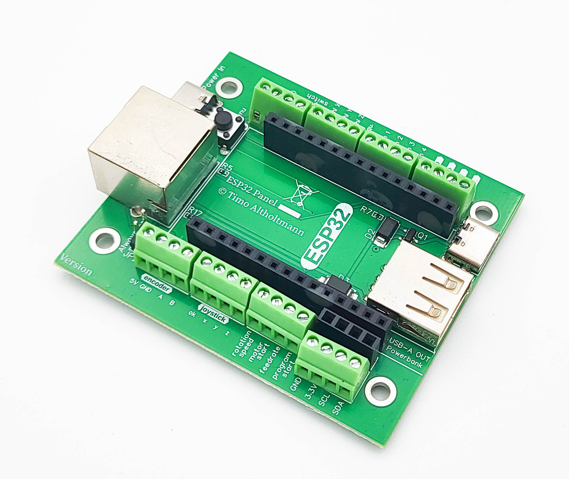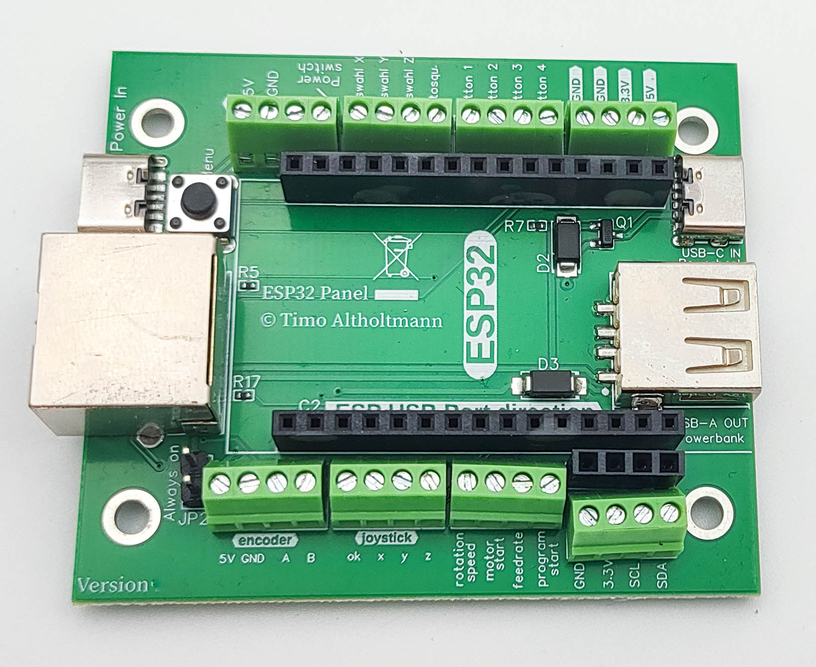 Die ESP32 Panel Platine ist für den Bau externer Bedienelemente gedacht. Der ESP32 auf der Platine kommuniziert dabei über WiFi mit dem OPEN-CNC-Shield 2. Der Funktionsumfang ist dabei auf die Verwendung mit dem Estlcam ControllerModule zugeschnitten. Wird ein anderer Controller genutzt, kann der Funktionsumfang stark eingeschränkt sein. Dazu bitte die Dokumentation der einzelnen ControllerModule beachten.
