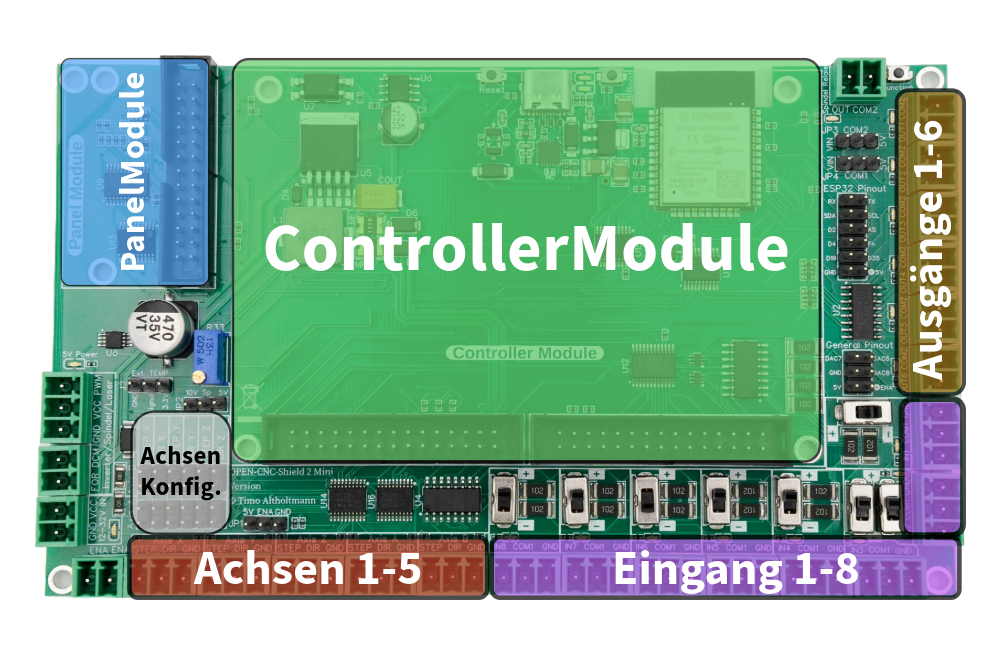 Es kann ein ControllerModule auf dem OPEN-CNC-Shield 2 Mini angeschlossen werden. Das ControllerModule bestimmt, welche Software für die CNC genutzt wird. Die unterstützten Funktionen sind der Dokumentation zu entnehmen: ControllerModules